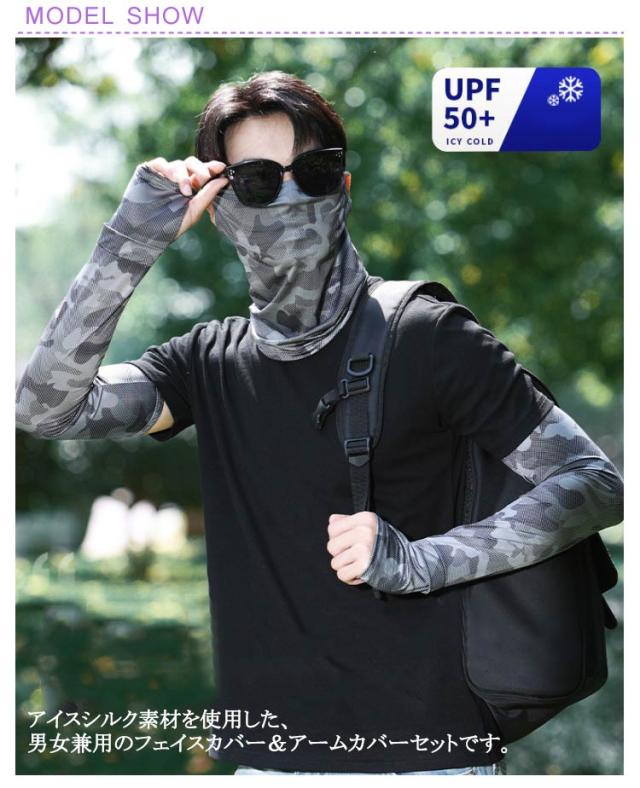 | 夏の強い日差しからしっかり守る! アイスシルク素材を使用した、男女兼用のフェイスカバー&アームカバーセットです。 ひんやりとした肌触りで通気性も良く、暑い季節でも快適にご使用いただけます。 耳掛けタイプのフェイスカバーは、ズレにくく首元までしっかりガード。 アームカバーは伸縮性抜群で、腕にぴったりフィットしながらも締め付け感なし。 | |