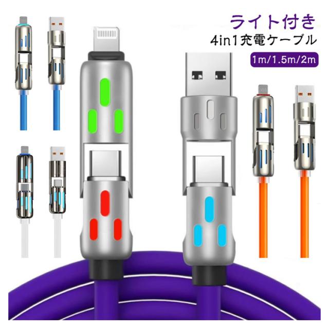 Lightning 2m 充電 USB-A マルチ Type-C ケーブル 1.5m ケーブル 【LEDライト付き】充電 4in1 LEDライト充電ケーブル 1m USB ライト付き iphone 急速 断線防止 高耐久 車載 【LEDライト付き】充電 iPad iPod iPhone15 Android iPad