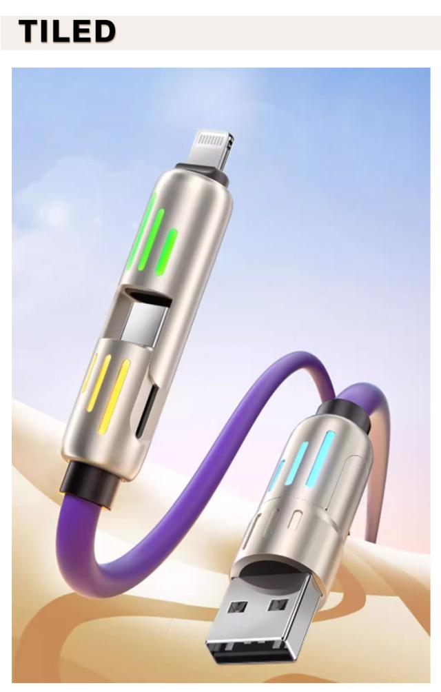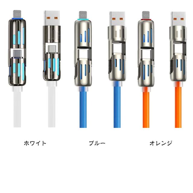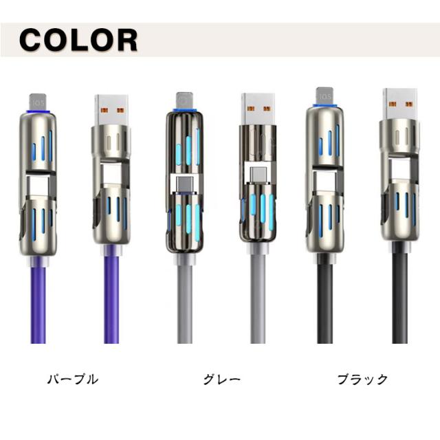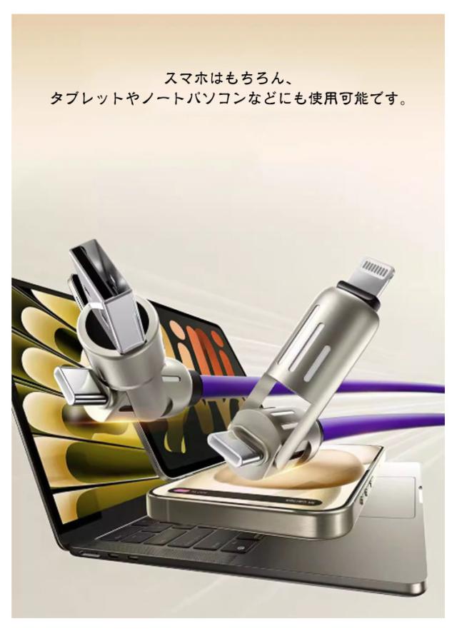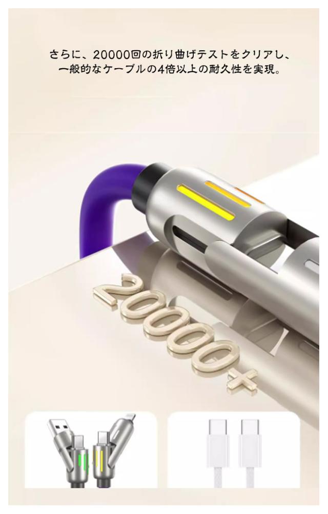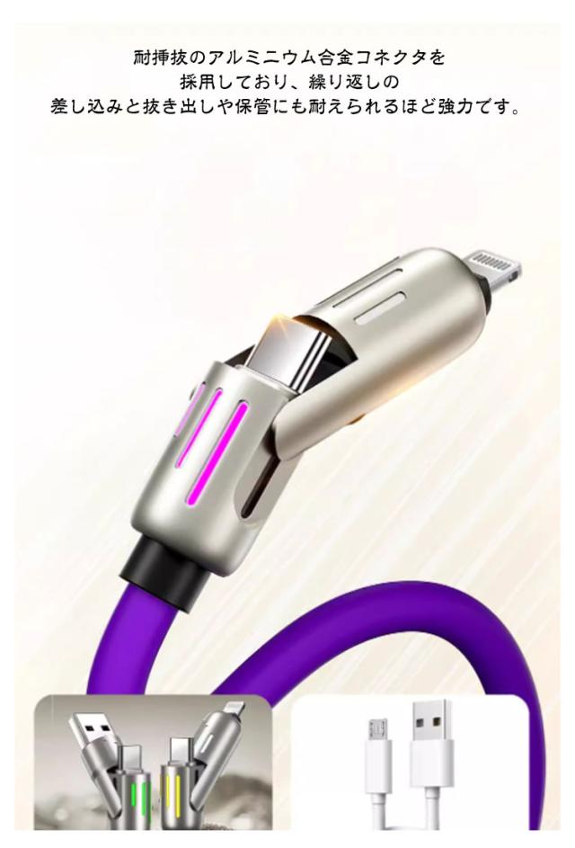 | ライト付き 4in1充電ケーブル 1m/1.5m/2m 最大480Mbpsの高速データ転送が可能です。 耐挿抜のアルミニウム合金コネクタを採用しており、繰り返しの差し込みと抜き出しや保管にも耐えられるほど強力です。 内部に高品質の銅線を採用し、安全性能が高く、充電速度がより速くなり、充電時間も短縮できます。 なめらかで柔らかい手触りと、絡みにくく扱いやすい設計で、快適に使用できます。 さらに、20000回の折り曲げテストをクリアし、一般的なケーブルの4倍以上の耐久性を実現。 スマホはもちろん、タブレットやノートパソコンなどにも使用可能です。 | |