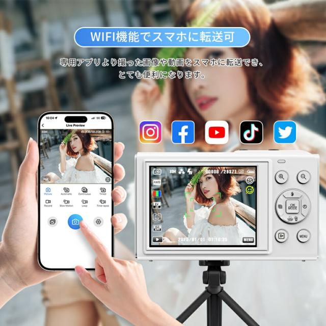 | 商品説明 | 【WIFI転送機能】今まで少ない本体にWIFI機能を搭載されておるコンパクトデジタルカメラです。撮影画像の取り扱いにおいて、スマホを手軽に活用できるのがWi-Fi対応デジタルカメラのメリットです。専用アプリより撮った画像や動画をスマホに転送でき、コードレスでシェアでき、カードリーダーやパソコンなどを利用する必要がありません。デジカメのWi-Fi機能によって外出先でも簡単にスマホと連携できるため、撮影した画像の転送やSNS投稿などの操作がスムーズにこなせます。下ボタンを長押すするとWiFi機能をオン/オフにすることができます。 |