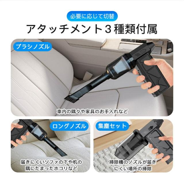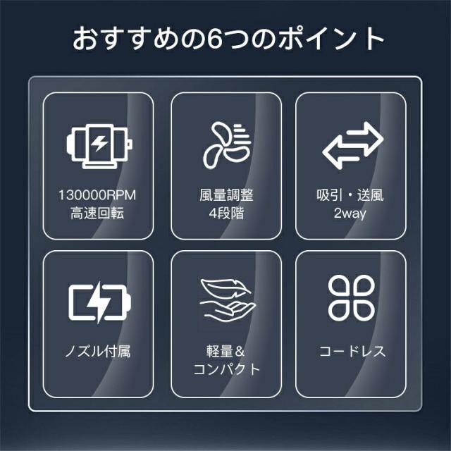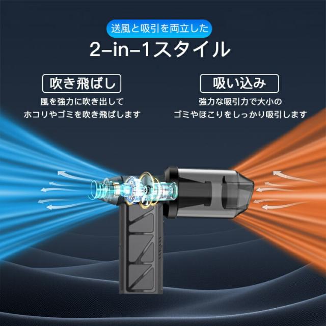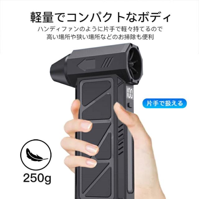 - 軽量でコンパクトなのに、吸引力が強力で驚きました。家の中や車内の掃除にぴったりです。2way機能で吸引と送風ができ、車内や細かい部分の掃除にも便利です。水洗いできるのでお手入れも簡単です。