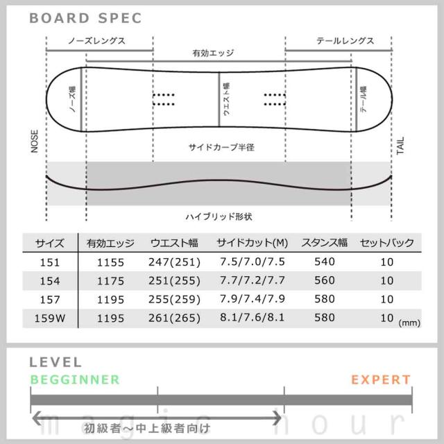 センター部分をフラットに、足元をキャンバーに設計されたハイブリッド構造。フリーランメインでレベルアップしたいライダーへ! 細めのウエストと柔軟なトーションでコントロールしやすく反応も早いのでターンもらくらく♪パークやパイプ、パウダーにも最高なオールラウンドモデル! 適度な反発力でグラトリにも。ミドルフレックスで初心者さんから中上級者まで楽しくスキルアップできるモデル! 形状: ハイブリッドキャンバー/ Wロッカー, ディレクショナルツイン, SW構造 |