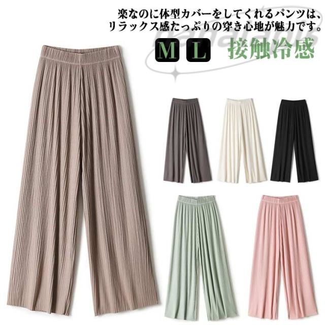 涼しい ワイドパンツ レディース 夏 ウエストゴム リラックスパンツ ボトムス プリーツパンツ プリーツパンツ 光沢感 縦ライン ウエストゴム パジャマ 女性 夏服 プリーツパンツ パンツ 冷感 パンツ