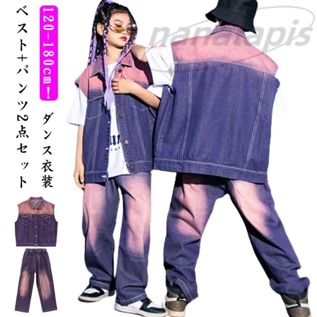 キッズ ダンス衣装 紫 男の子 セットアップ 団体服 ロングパンツ 絞り染め 女の子 子供 2点セット ジャズダンス 袖なし デニムシャツ 長ズボン デニム キッズ ジュニア かっこいい ゆったり イベント 応援団 ベスト 発表会 文化祭 演出服 体育祭
