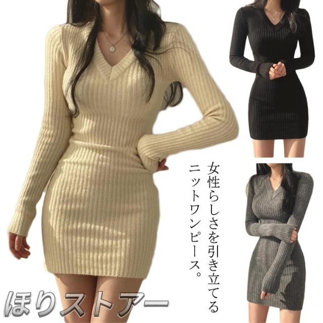 ニットタイトワンピース きれいめ Vネック 韓国風 リブニットワンピ 長袖 ニットタイトワンピース 伸縮性 タイトワンピース ニットワンピース レディース ミニ丈 ワンピース 秋冬 ストレッチ 黒 膝上丈 おしゃれ 可愛い タイト