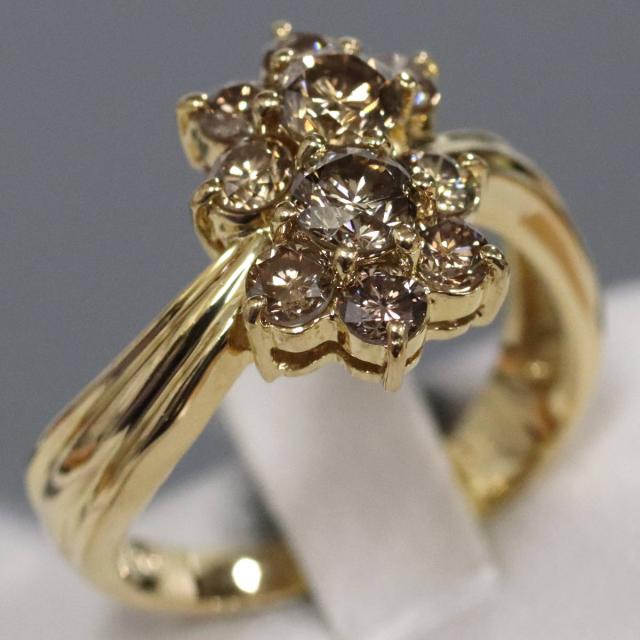 K18ブラウンダイヤモンドリング フラワーモチーフ D1.00 4.4g #11.5 イエローゴールド 1カラット