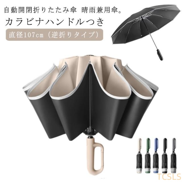 ワンタッチ 折りたたみ傘 逆折りタイプ 自動開閉 日傘 雨傘 晴雨兼用 逆さ傘 カラビナハンドル 折り畳み傘 軽い UVカット 紫外線遮断 日焼け対策 メンズ レディース 男女兼用 軽量 大きめ 大きい 10本骨 頑丈 耐風 コンパクト 逆さま傘 防風 梅雨 遮光 直径107cm