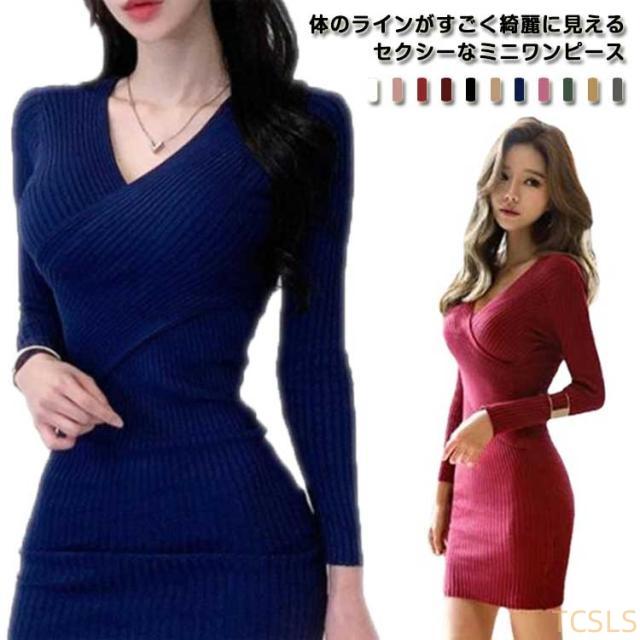 タイト ニットワンピース セクシー ショート丈 ワンピース タイトワンピース Vネック リブニット 姫系 長袖 タイト ミニ丈 パーティドレス ミニワンピ タイト お嬢様 キャバ嬢 デート服 キャバクラ キャバドレス 韓国風 レディース 大人女性 可愛い