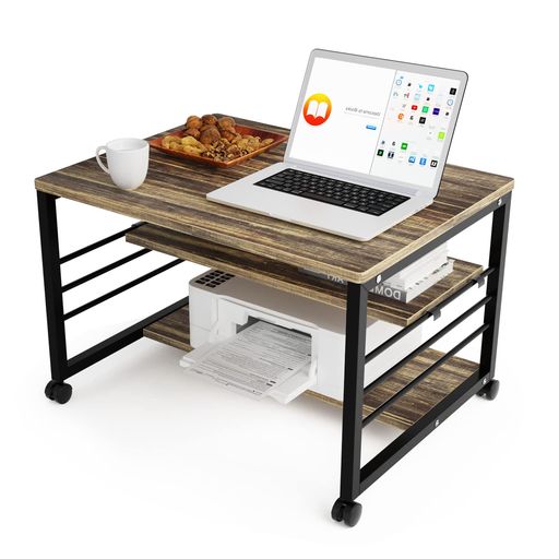 【可動棚1枚付き&収納棚付き】1.デスク周りのアイテムに幅広く対応していただするようこ、棚板には可動棚を採用しました。普段の使用時は、棚板を奥に移動で、足が当たりでくい快適スタイルになれます。ブリンタ使用時は、棚板を手前に設置することで、用紙が設置しやすいこだわり設計となっております。可動翻はサイドバーにフックを掛けるだけの簡単設置。組み立て後の棚板の高さも簡単に行っていただけます。下棚には、プリンター、バッグ、本、ペーパータオルなどを収納するのに十分なスペースがあります。