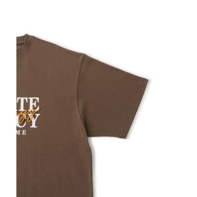 立体感のあるブラシ刺繍と、洗練されたタイポグラフィプリントを組み合わせた半袖Tシャツ。
