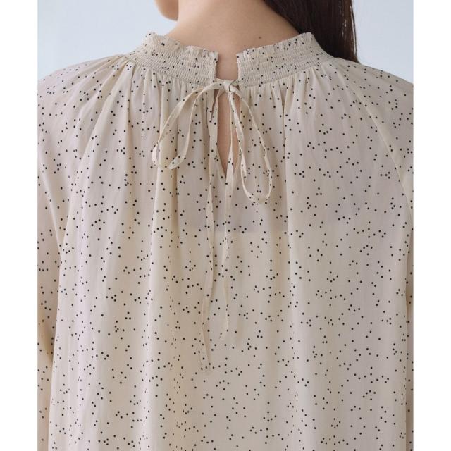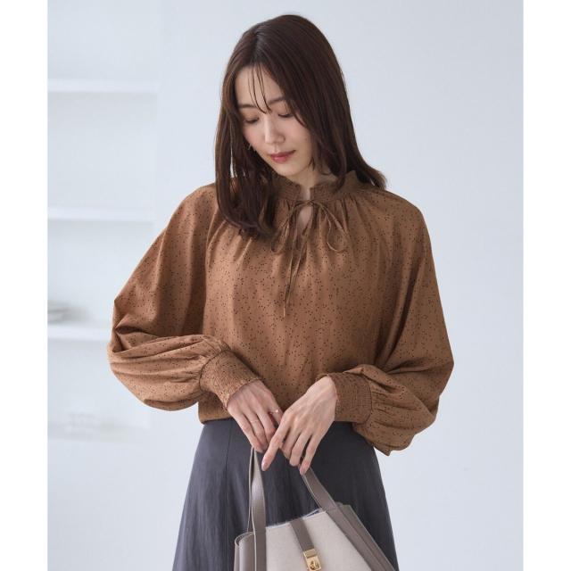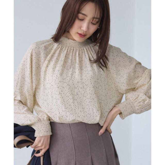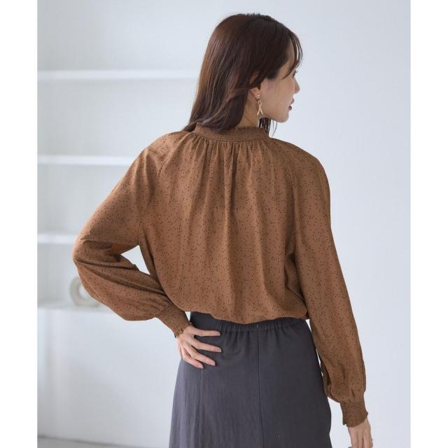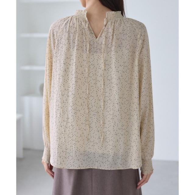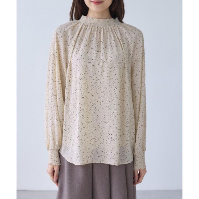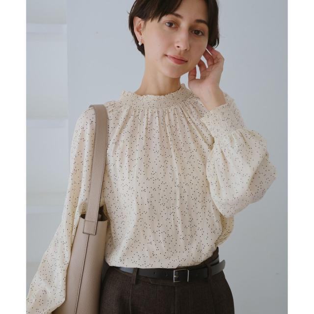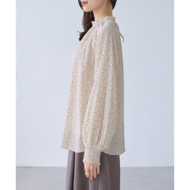 ・襟のシャーリングがレディライクなポイントになっているプルオーバーブラウス。