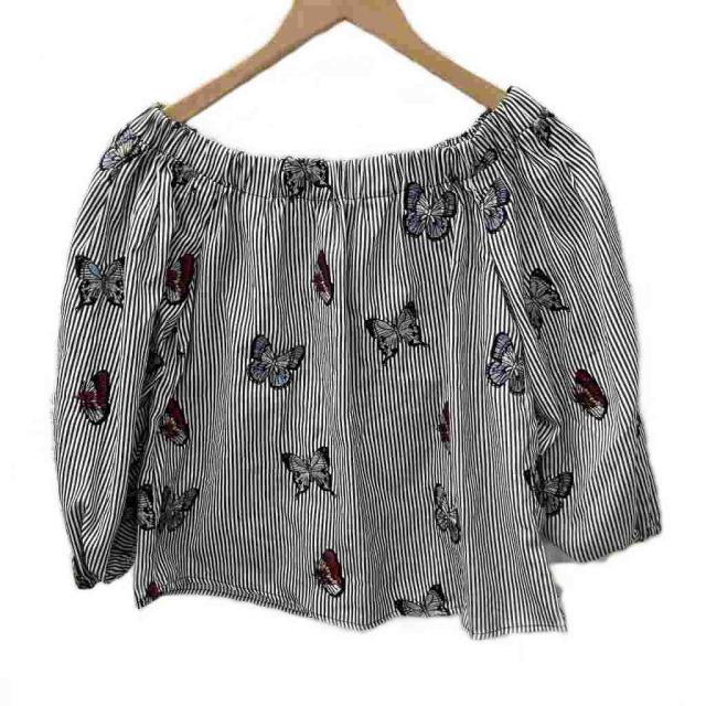 【中古】ザラ ベーシック ブラウス 半袖 7分袖 ストライプ柄 蝶々 刺繍 XS 白 ホワイト グレー 2521/426/070