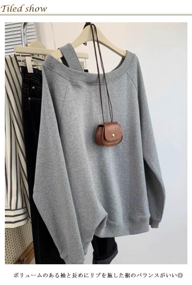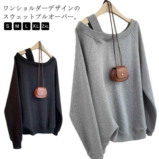 レーナー 長袖 アシンメトリー プルオーバー 韓国ファッション スウェット グレー 秋 オーバーサイズ トップス カジュアル 可愛い 無地 ショート丈 ボリューム袖 プルオーバー オフショルダー ワンショルダー プルオーバー グレー ブラック