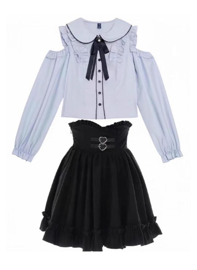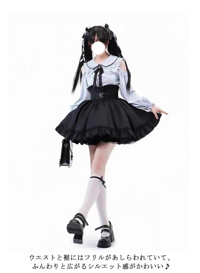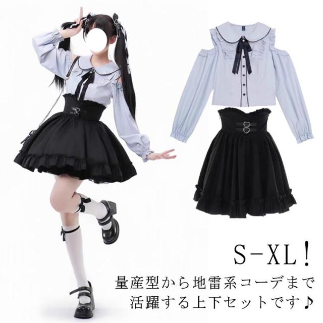 かわいい スカート レディース ハートベルト セットアップ ブラウス 肩開き 病みかわいい トップス 長袖 Aライン 2点セット 参戦服 量産型 ブラウス フリル ミニスカート ハイウエスト フレア ボトムス春 夏 秋 冬 おしゃれ ロリータ ゴスロリ