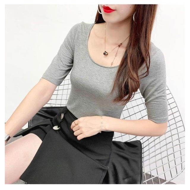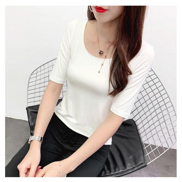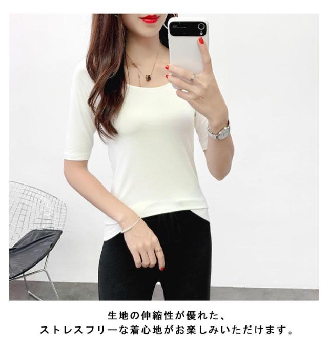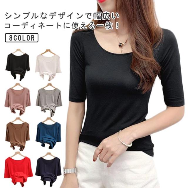 夏 秋 春 通気性 Tシャツ カットソー 5分袖 トップス 送料無料 モーダル 襟ぐり広め Uネック 無地 インナー 肌着 シンプル 薄手 ストレッチ 吸湿性 レディース
