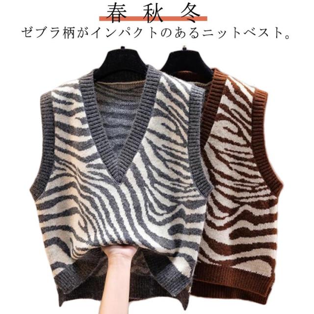 トップス 秋 ゼブラ柄 ベスト シマウマ柄 Vネック ニット プルオーバー ニット ニット ニットベスト 春 ジャガード 冬 レイヤード 重ね着 ノースリーブ セーター ブラック 大人可愛い ショート丈 カジュアル おしゃれ 茶色 レディース