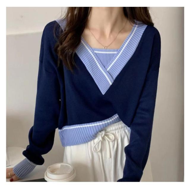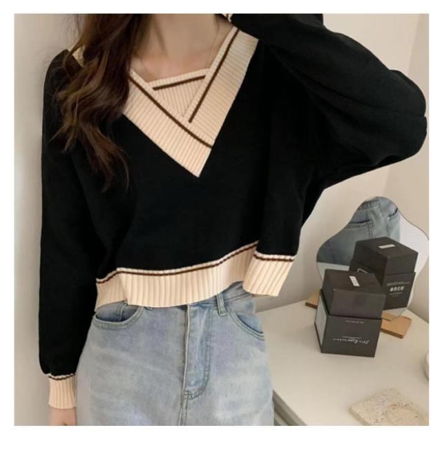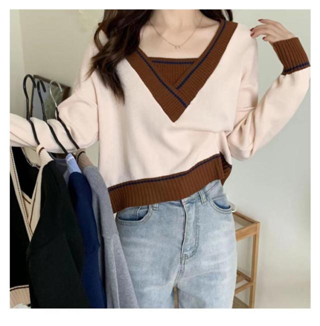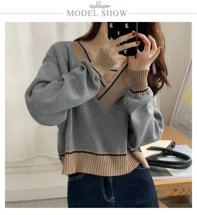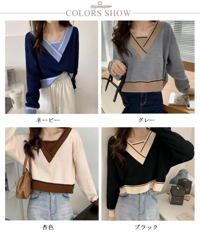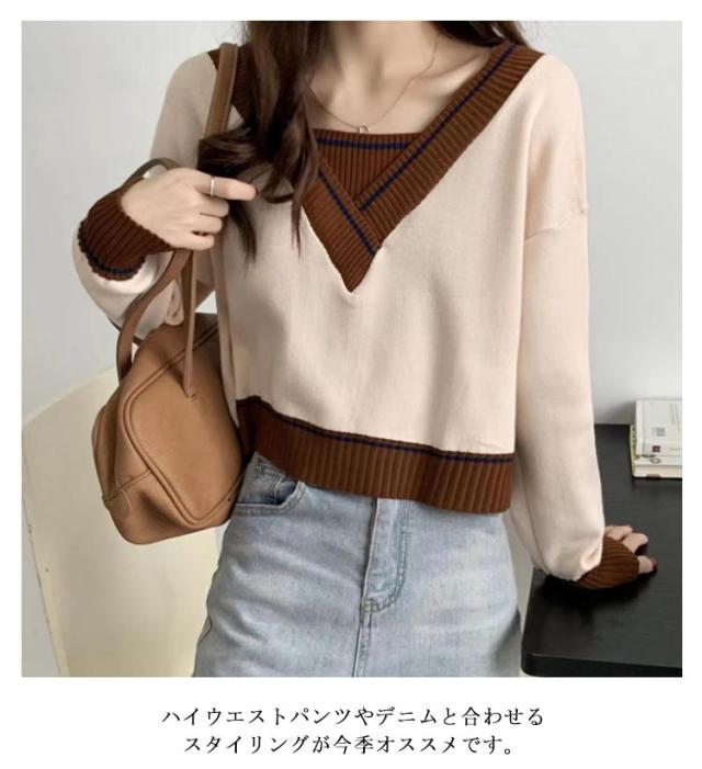 トレロセーター ゆったり ニット セーター Vネック ショート丈 秋 プルオーバーニット 長袖 シンプル 春 レディース 冬 重ね着風 配色