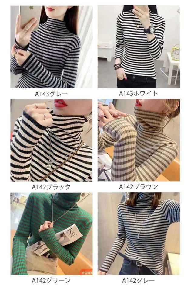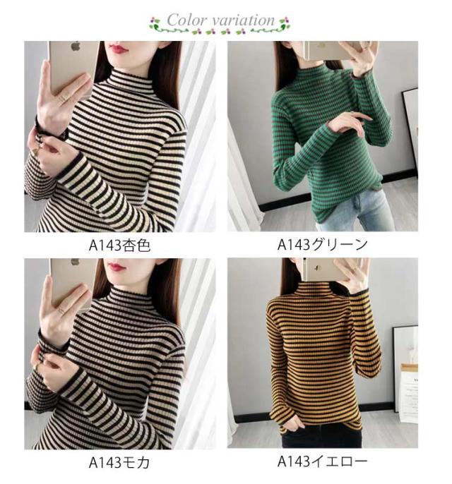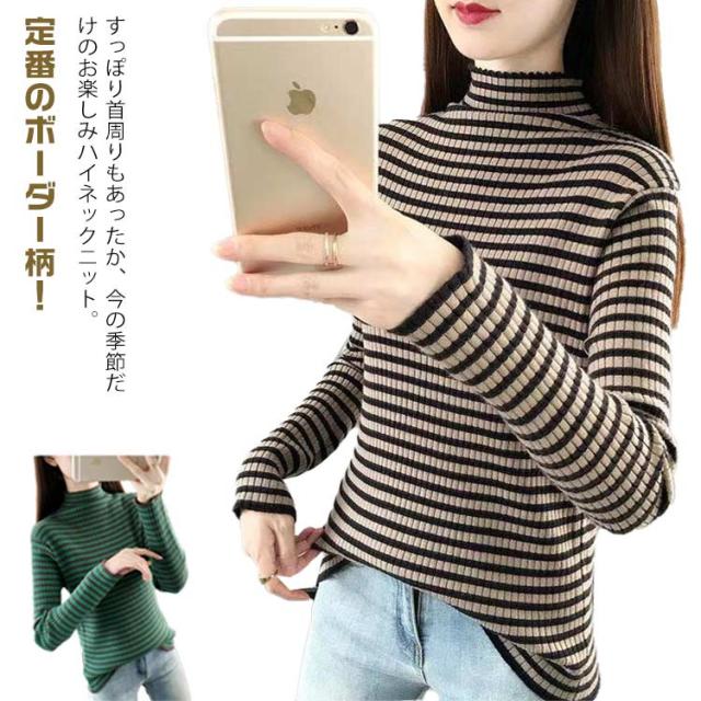 秋冬 ニット ハイネック セーター ハーフハイネック インナー スリム ボーダー柄 レディース 伸縮性 冬物 秋 冬 長袖