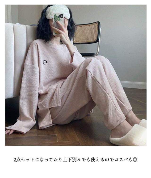 冬 カットソー 長袖 レディース 寝巻き ワンポイント 上下セット 刺? ルームウェア 秋 パンツ 部屋着 セットアップ 長袖 長ズボン ロングパンツ パジャマ オーバーサイズ ナイトウェア かわいい おしゃれ イヌ 犬柄 旅行 入院 着替え 大人 学生 女子 ゆったり ワッフル