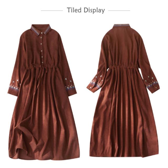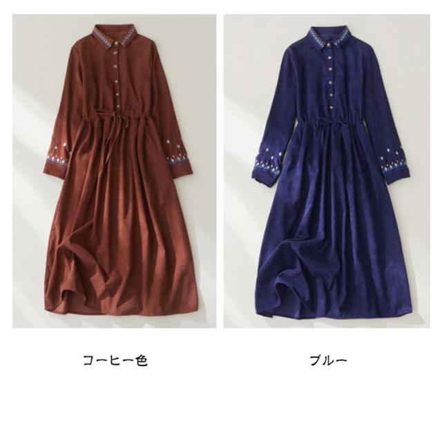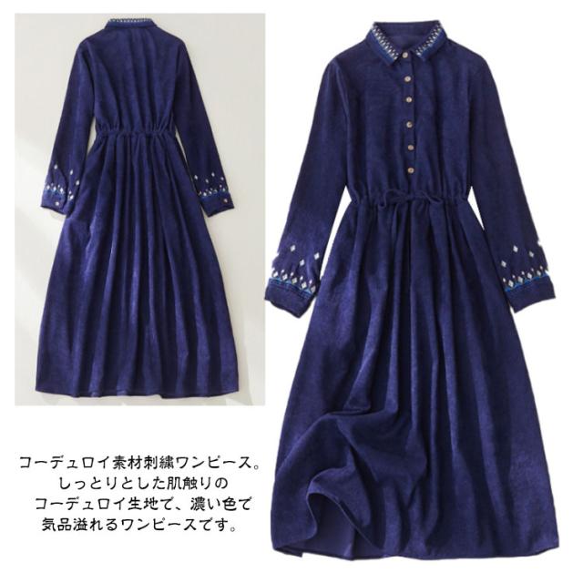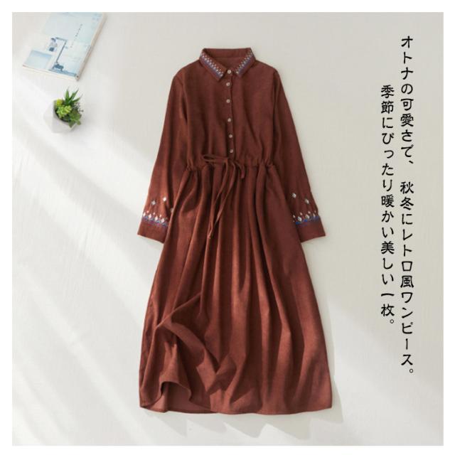 コーデュロイ 長袖 ミモレ ワンピース ロング 着痩せ ワンピ レディース ゆったり 大人 丈 刺繍 コーデュロイワンピース 刺繍 ロング丈 秋 冬 レトロ 春 オフィス エレガント 通勤 カジュアル おしゃれ 可愛い 40代 50代