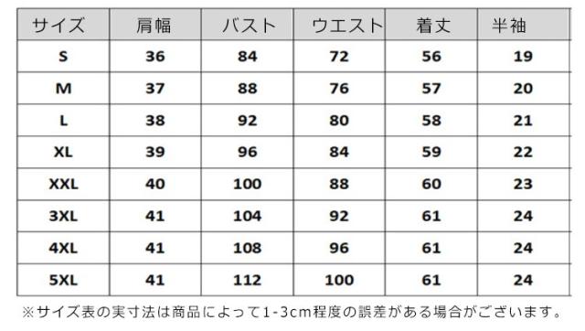 | サイズについての説明 | サイズ 肩幅 バスト ウエスト 着丈 半袖 ※サイズ表の実寸法は商品によって1-3cm程度の誤差がある場合がございます。 |