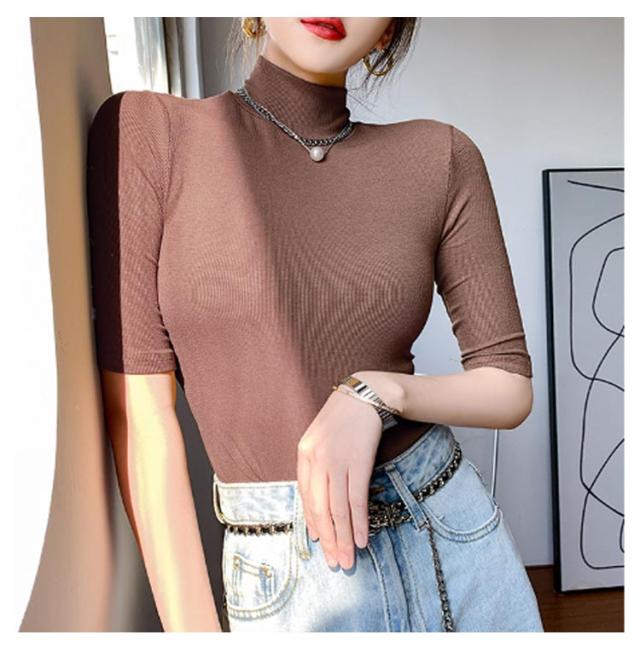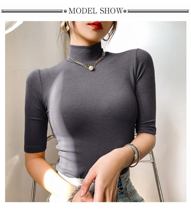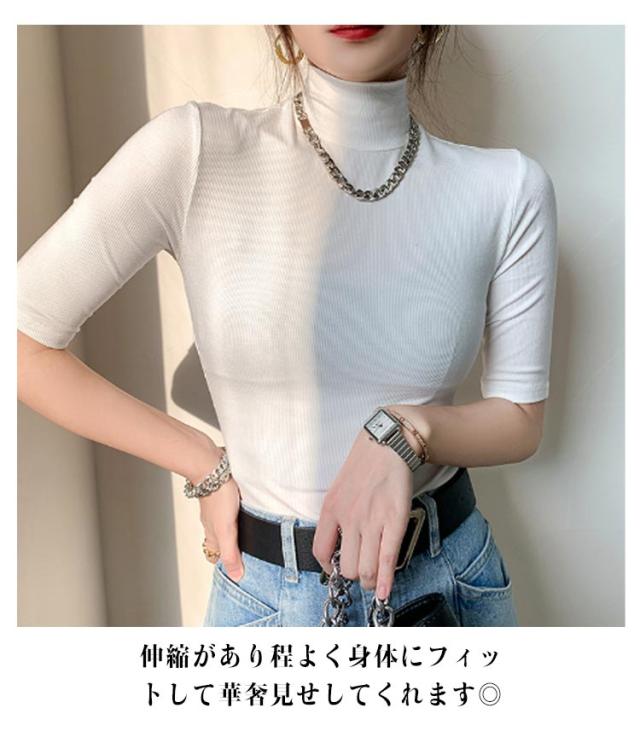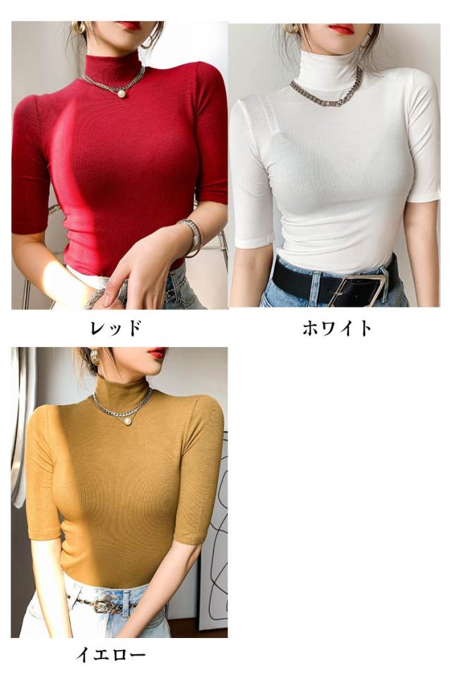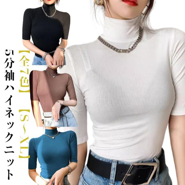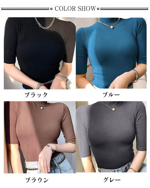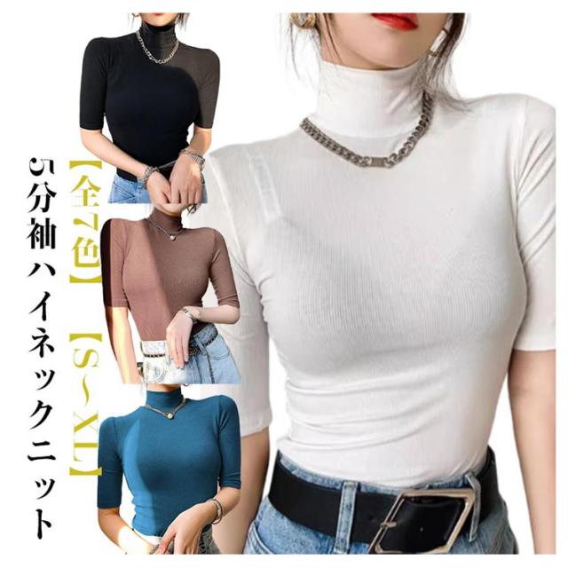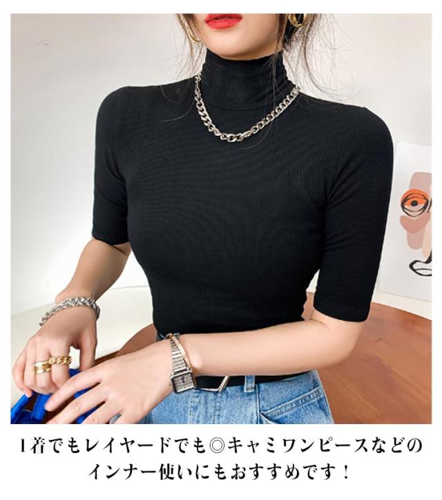 ハイネック インナー ハイネック カットソー レディース タートルネック 半袖 スリム トップス ニットソー ニット タイト 5分袖 プルオーバー カジュアル オフィスカジュアル 春 夏 秋 冬