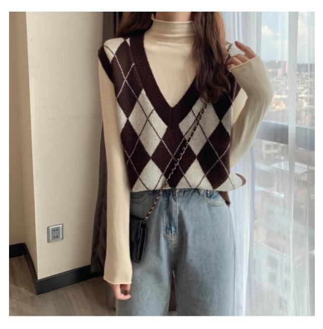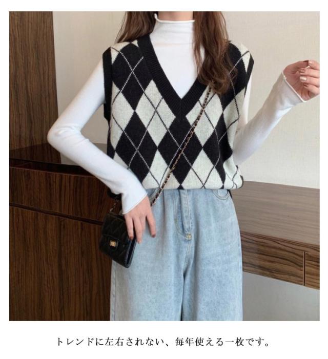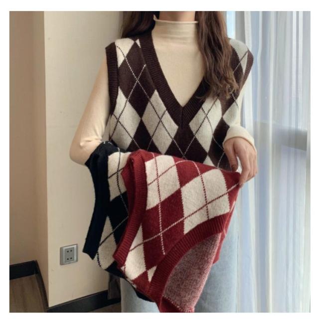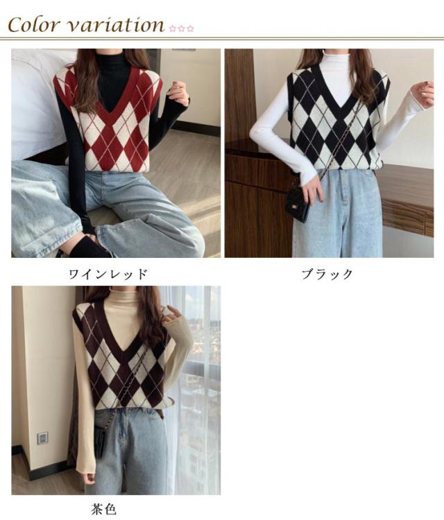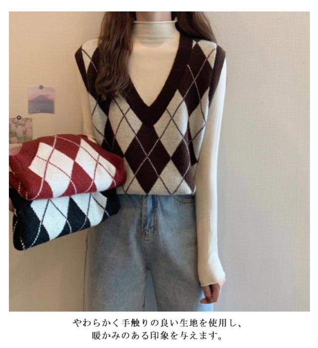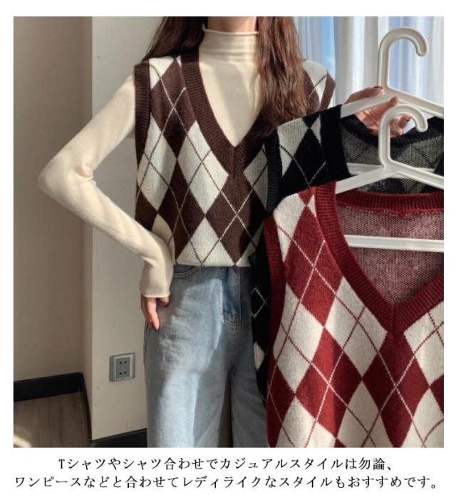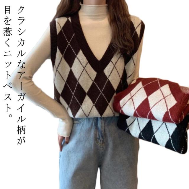 ニット 茶色 ニット ニットベスト 春 ベスト プルオーバー レディース 総柄 ベスト 冬 トップス 菱柄 Vネック ノースリーブ ジャガード 秋 重ね着 レイヤード セーター 学生 大人 可愛い カジュアル おしゃれ アーガイル柄