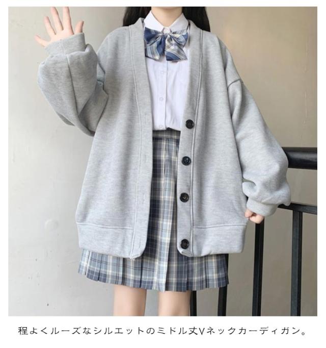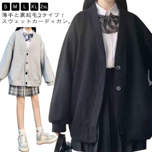 グレー 薄手と裏起毛2タイプ 制服 女子 スクールカーディガン 裏起毛 パーカー 羽織り Vネック 学生服 スウェット生地 前開き 高校生 ボリューム袖 ボタン アウター 秋 冬 春 中学生 スウェットカーディガン 無地 かわいい ゆったり 大きいサイズ 黒 レディース