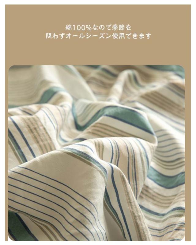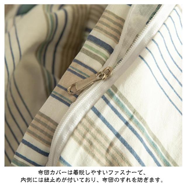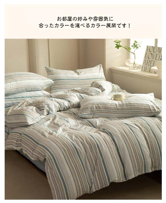 | マルチストライプ柄のベッドカバーでお部屋を一気におしゃれに! 綿100%なので季節を問わずオールシーズン使用できます 布団カバーは着脱しやすいファスナーで、内側には紐止めが付いており、布団のずれを防ぎます。 枕カバーはファスナーなしで出し入れ簡単!! 上品なストライプがお部屋を一段とおしゃれにしてくれます。 お部屋の好みや雰囲気に合ったカラーを選べるカラー展開です! | |