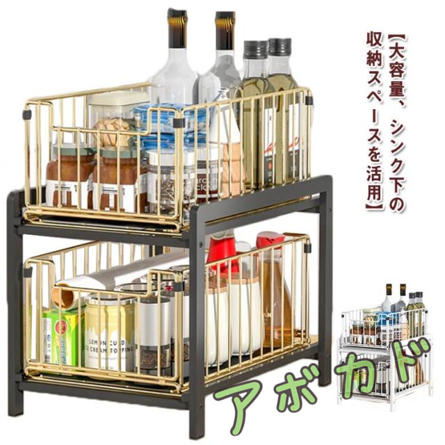 | キッチンの中でも収納に困りがちなのがシンク下、扉タイプだと水道管が通っていてスペースをいかせない、スライド式の収納用品を使ってシンク下の収納スペースを改造してみませんか。2段引き出し式で物の出し入れが便利、シート付きで収納物が落ちしません。大容量デザインでたっぷり収納、円弧デザインで使い安全、ゴム製足で家具に傷を与えません。さ、どうでしょうか、ちょっとした工夫をして、使いやすさは格段にアップ! 収納グッズの全体サイズ:幅26cm、奥行き37cm、高さ38.5cm。扉タイプのシンク下は奥行きが深くて、普通のキッチン収納品では奥の空間は無駄になってしまう。このシンク下収納はどうですか、長くてトレーも深型で、しかも引き出しタイプで、シンク下の空間をむだなく使うことができます!背の高い調味料やスポンジやたわし、缶詰や洗剤類、袋物などを引き出しにどんどん収納しましょう。収納グッズを組み合わせれば、不便だったシンク下が快適に使える。 焼付け塗装で錆びにくくので、お手入れは簡単になります。雑巾で拭くことも丸洗いことも可能。耐荷重 15 kg、ゴム製足で、滑りにくく家具にキズも付けません。2段引き出しデザインでシンク下に置きても引きのみで中の収納物を簡単に取り出します。2個引き出しがあるこそ、分類収納できます。上段はスポンジやたわし、手袋などのストック、下段は洗剤類のパウチタイプの詰替えストックを入れています。 幅が狭いラックで排水管を完璧に避けることができるので、幅広く使えます!シンク下収納として、キッチンや洗面台下に大活躍。スプレーボトルや体用洗剤、調味料や調味道具などのを収納できます。時に、バスケットの作用もあり、脱衣室に置いて汚れる服を収納、ランドリラックに置いて、タオルなどを収納、本棚として、本を分類収納できます。部屋の隅々を無駄なくて使えましょう。 | |