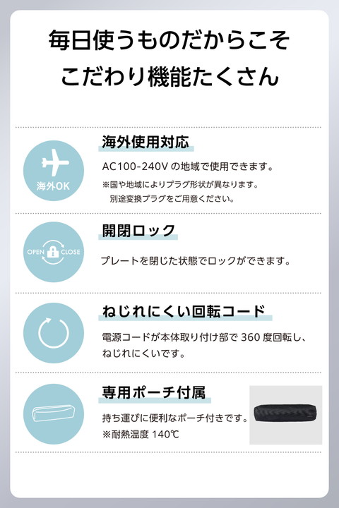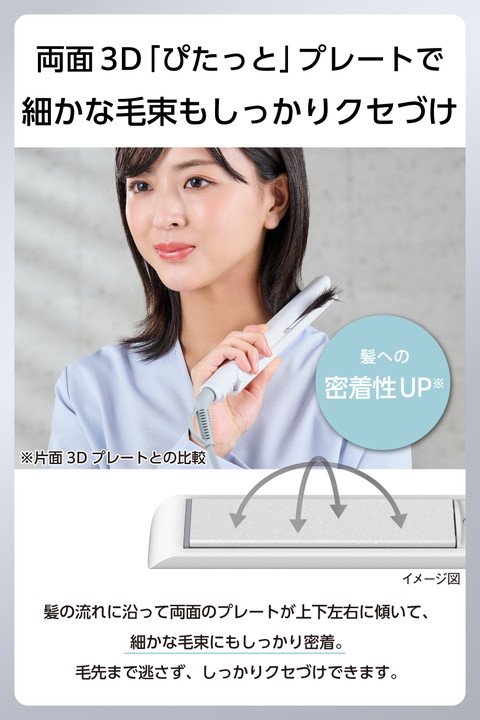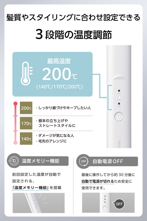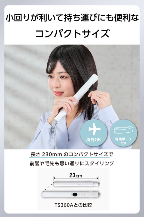 ボブ〜ショートヘアや前髪のセットにおすすめ。コンパクトサイズで動かしやすく、根元から毛先まで細かなアレンジが可能なストレートヘアアイロンです。ナノセラミックコーティングで、ツヤと動きのある美しい仕上がりを実現します。![]() ■長さ230mmのコンパクトサイズで動かしやすく、前髪や毛先も思い通りにスタイリングできます。 ■すべりやすさ32%UP!粒子が細かい「ナノセラミック」を配合したコーティングで、摩擦ダメージに配慮した、ひっかかりのないスムーズな髪すべりを実現します。 ※チタンコーティングの当社ヘアアイロンとの比較 ■温度は140℃/170℃/200℃の3段階で調節可能。髪質や希望のスタイリングに合わせて設定できます。 ■両面3D「ぴたっと」プレート搭載。髪の流れに沿って両面のプレートが上下左右に傾いて、細かな毛束にもしっかり密着。毛先まで逃さず、しっかりクセづけできます。 ■上下プレートを温めるダブルヒーターを採用し、電源を入れてから約30秒(※)で使用可能な温度に到達。スピーディーな立ち上がりで、時間のない朝でも焦らずにスタイリングできます。 ※最高温度設定時100℃到達時間 ■温度調節は電源スイッチボタンで操作。設定した温度はLEDライト表示で見やすいです。 ■前回設定した温度が自動で設定される、温度メモリー機能を搭載。使う度温度設定を行うわずらわしさがありません。 ■自動電源OFF機能を搭載。最後に操作してから約30分後に自動で電源が切れるため、安全に使用できます。 ■プレートを閉じた状態でロックが可能。収納時や旅行時に便利です。 ■使用時に高温となる部分に触れないよう、境目を分かりやすくしています。電気用品安全法(PSE)の技術基準に適合した安全性の高い製品です。 ■スリムで持ちやすい形状とマットなカラーリング。使用シーンを選ばないミニマルなデザインです。 ■電源コード根元のフック穴でS字フックなどに吊るして収納できます。場所を取らず、使いたいときにサッと取り出せます。 ■持ち運びに便利なポーチ付きです。 ※耐熱温度140℃ ■電源コードが本体取り付け部で360度回転。ねじれにくく使いやすいです。 ■AC100-240Vの地域で使用できます。海外旅行の際にも使えて便利です。 ■※国や地域によりプラグ形状が異なります。別途変換プラグをご用意ください。 ■1965年の創業以来、テスコムが製造・開発してきた業務用ドライヤー『Nobby』は、高い性能からサロンシェアNo.1(数量ベース)(※)を獲得。その技術力が生かされています。 ■※2024年4月〜2025年3月の国内美容院(サロン)への業務利用ドライヤー販売荷数(サロンでの販売分除く)(東京商工リサーチ調べ) ![]() ■電源方式:AC100-240V 50/60Hz ■消費電力:26-27W ■プレートサイズ:18mm×77mm ■温度調節幅:140℃、170℃、200℃ (3段階 30℃刻み) ■立ち上がり時間:約30秒(最高温度設定時100℃到達時間) ■コーティング:ナノセラミックコーティング ■スイッチ:電源スイッチ/温度切替スイッチ ■外形寸法:幅約230mm×奥行約25mm×高さ約28mm(収納時)、幅約230mm×奥行約25mm×高さ約71mm(使用時・プレート開の状態) ■質量:220g(コード込み) ■主材料:PET ■カラー:ホワイト ■コード長:1.7m ■温度ロック機能:× ■温度メモリー機能:〇 ■自動電源OFF機能:〇(約30分後) ■開閉ロック機能:〇 ■ラク抜きプラグ:× ■海外使用:〇 ■付属品:専用ポーチ(耐熱温度140℃) ■パーツ:専用ポーチ(耐熱温度140℃)(TA035110) ■保証期間:1年間 |