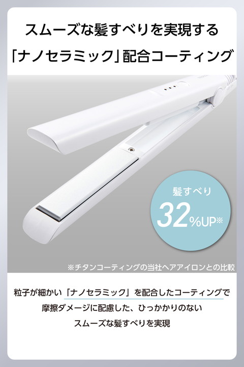 ボブ〜ショートヘアや前髪のセットにおすすめ。コンパクトサイズで動かしやすく、根元から毛先まで細かなアレンジが可能なストレートヘアアイロンです。ナノセラミックコーティングで、ツヤと動きのある美しい仕上がりを実現します。