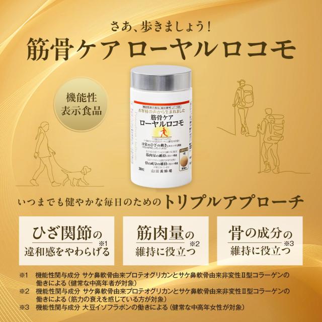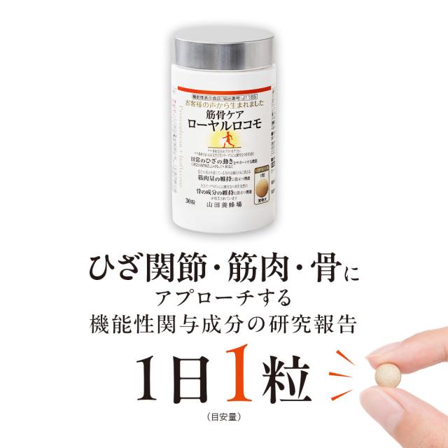 【山田養蜂場】 筋骨ケアローヤルロコモ 30粒ボトル入 プロテオグリカン サケ鼻軟骨由来 非変性2型コラーゲン 大豆イソフラボン ローヤルゼリー サプリメント サプリ 健康食品 健康 ひざ関節 動き サポート 曲げ伸ばし 立つ 歩く 座る ギフト 送料無料 ホワイトデー