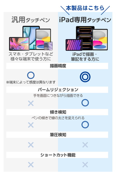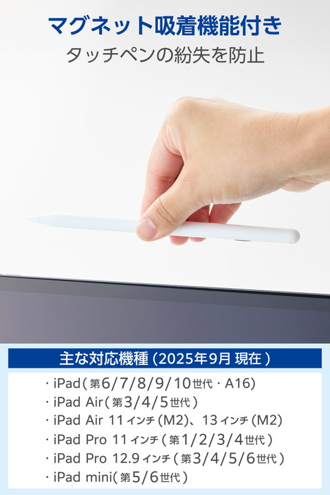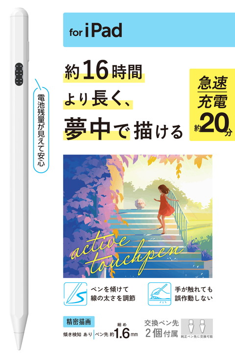 約16時間の連続使用が可能な、iPad用アクティブタッチペンです。電池残量は画面に数字で表示されるため、充電のタイミングがひと目でわかり、うっかり充電し忘れるのも防げます。約20分でフル充電できる急速充電機能を搭載。長時間の作業にぴったりで、集中して描き続けたい方におすすめです。![]() ■純正のApple Pencilに近い描き心地の、iPad用アクティブタッチペンです。 ■USB Type-C(TM) - USB Type-Cケーブルで充電でき、約16時間の連続使用が可能。長時間の作業にもおすすめです。 ■※ご使用状態によっては、目安の時間よりも早く充電が必要になる場合があります。 ■電池残量は画面にデジタル数字で表示されるので、充電のタイミングがひと目でわかります。うっかり充電を忘れる心配もありません。 ■約20分でフル充電可能な急速充電機能を搭載。電池が切れても充電してからすぐに使用できます。 ■約1.6mmのペン先でより繊細なタッチを実現。図面や細かいイラスト作業などにおすすめです。 ■ペン先は導電性に優れたポリアセタール樹脂(POM)を採用し、滑らかな描き心地で画面を傷つけにくいです。 ■ペンの傾きを検知する機能で、傾き具合によって線の太さを変えられます。 ■ペン先の接地点と実際に描画される位置とのズレを軽減しているので、狙ったところに書き込みやすいです。 ■※完全にズレを感じなくなるわけではありません。 ■手のひらが画面に接触した状態でも、ペンを認識して誤動作を防止するパームリジェクション機能を搭載しています。 ■タッチペンの側面にはマグネット面があり、iPadに吸着ができるので紛失を防ぎます。 ■※iPadに装着するケースによってはiPad本体のマグネット部分が隠れてしまい、本製品を付けられない場合があります。 ■マグネット面がフラットになっていて、テーブルや床に置いても転がりにくい形状です。 ■ペアリングが不要で、電源をオンにするだけですぐに使用できます。 ■指先でのタッチ操作と違い、画面を汚さずに操作可能です。 ■タッチ操作はもちろん、スライド・スワイプ操作も快適に行えます。 ■※iPadの画面を傷付けるおそれがあるため、必ず画面保護フィルムを貼ってご使用ください。 ■※画面保護フィルムをご使用の際は、フィルムの種類によっては、操作時にこすれ音が生じたり、ペンの反応が悪くなることがあります。 ■交換用のペン先を2個と、USB Type-C - USB Type-Cケーブルを付属しています。 ■※本製品にACアダプター(AC充電器など)は付属していないため、出力5V/1A以上のUSB出力アダプターを別途ご用意ください。 ■ペン先は、Apple Pencil (第1世代)、(第2世代)、(USB-C)、(Apple Pencil Pro)と交換が可能で、お好みの書き味に合わせて替えることができます。 ■※USB Type-C and USB-C are trademarks of USB Implementers Forum ■自社環境認定基準を1つ以上満たし、『THINK ECOLOGY』マークを表示した製品です。 ■環境への負荷軽減のため、輸送効率を高める設計の外装箱を使用した製品です。 ![]() ■対応機種:2018年以降のiPadに対応(一部機種を除く) ※iOS 12.2以降に更新する必要があります。※2025年9月現在。対応確認済み機種の一覧はhttps://www.elecom.co.jp/r/n769をご覧ください。 ■外形寸法:全長:約165mm、直径:約9.1mm、ペン先:約1.6mm ■材質:ペン先:ポリアセタール樹脂(POM)、本体:アルミニウム・マグネット ■カラー:ホワイト ■質量:約14g ■電池:リチウムイオン電池 ■使用時間:約16時間 ※ご使用状態によっては、目安の時間よりも早く充電が必要になる場合があります。 ■充電時間:約20分 ※使用状況や環境により変化します。 ■保証期間:1年間 ■付属品:USB Type-C(TM) - USB Type-Cケーブル、交換用ペン先2個 ■筆圧感知:× ■ワイヤレス充電:× ■傾き検知:○ ■パームリジェクション:○ ■備考:※特定のアプリやソフトにおいて、専用タッチペンのみでの描写設定をしている場合は使用できないことがあります。 |