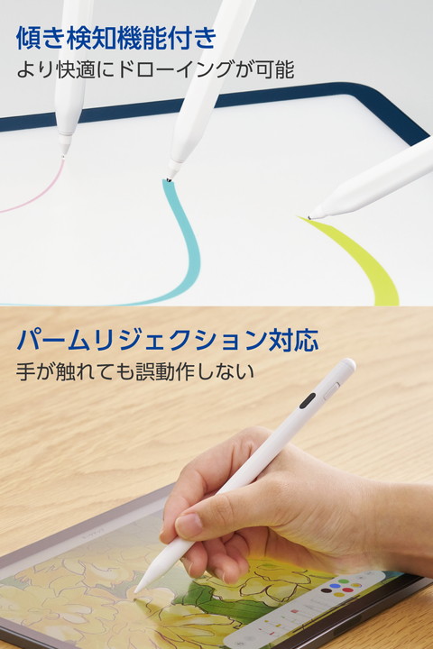 エレコム iPad用 アクティブ タッチペン 充電式 iPad専用 デジタルインジケーター パームリジェクション対応 傾き検知 磁気吸着 USB-C充電 急速充電 交換ペン先付属 ホワイト┃P-TPACSTAP12WWH
