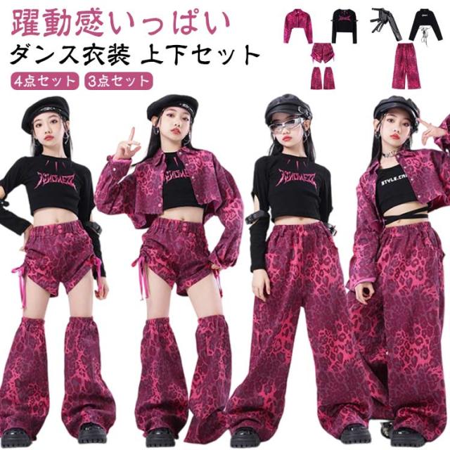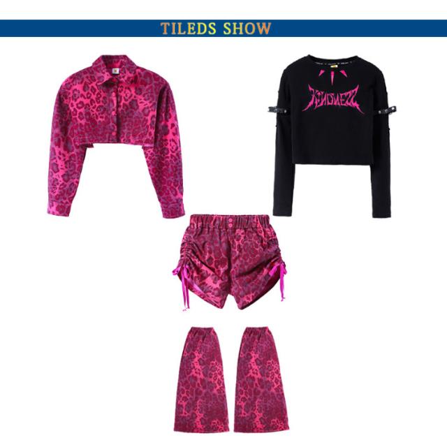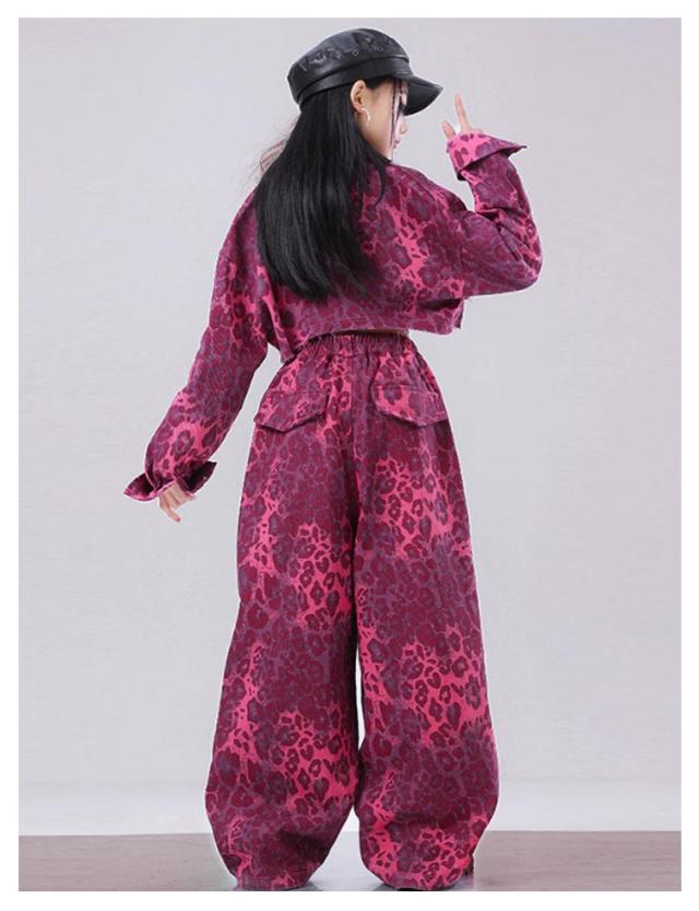 上品 デニム生地 ピンク 豹柄 キッズ ダンス衣装 セットアップ 女の子 チア チアガール 韓国 k-pop トップス ファッション ヒョウ柄 サルエルパンツ レッグウォーマー ヒップホップ ジャズダンス 発表会 演出服 団体服 練習着 ストーリー系 原宿系 ギャル系 おしゃれ 派手