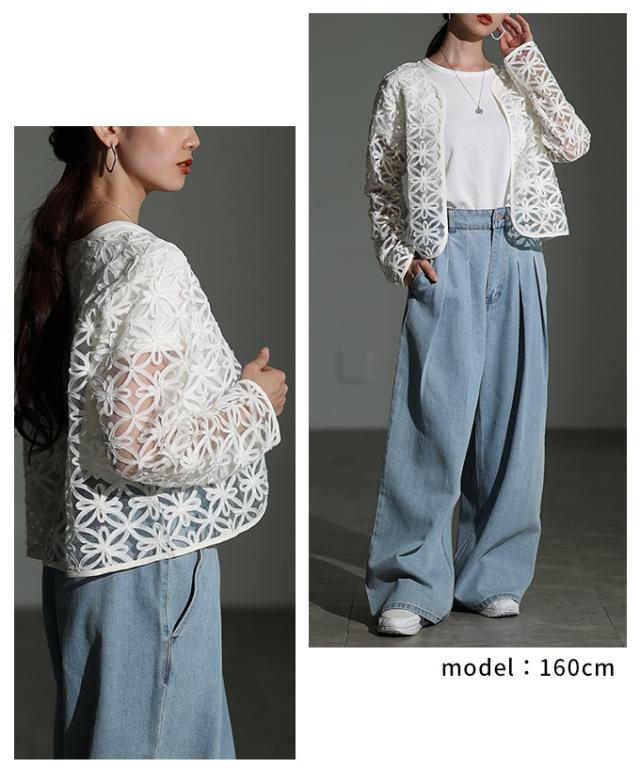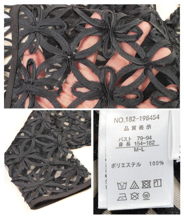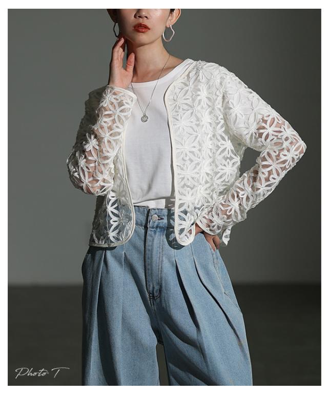 着丈は骨盤にかかるくらいです。袖は小指が隠れるくらいです。脇ぐりも身幅もほどよい余裕があり楽に着用できました。ボタンレスのシンプルなデザインで合わせやすそうです。全体に施されたテープリボンが華やかです。細かいチュール生地で着心地もよかったです。