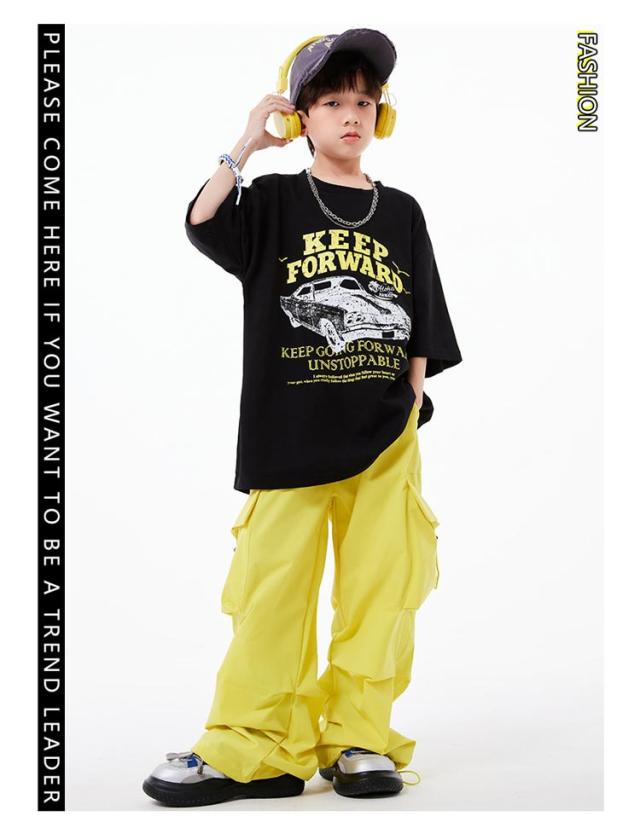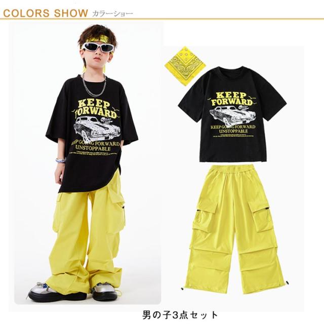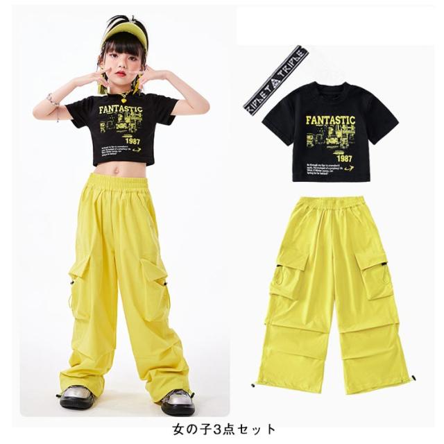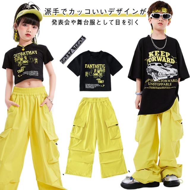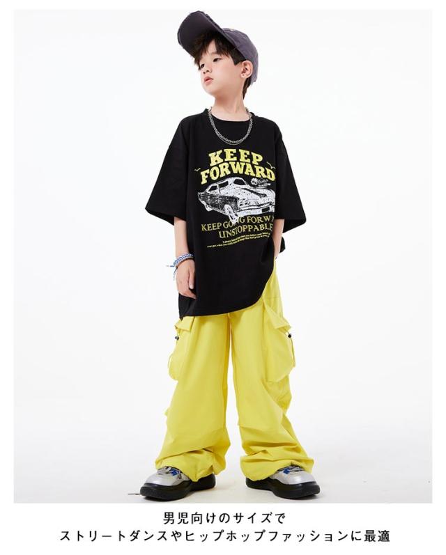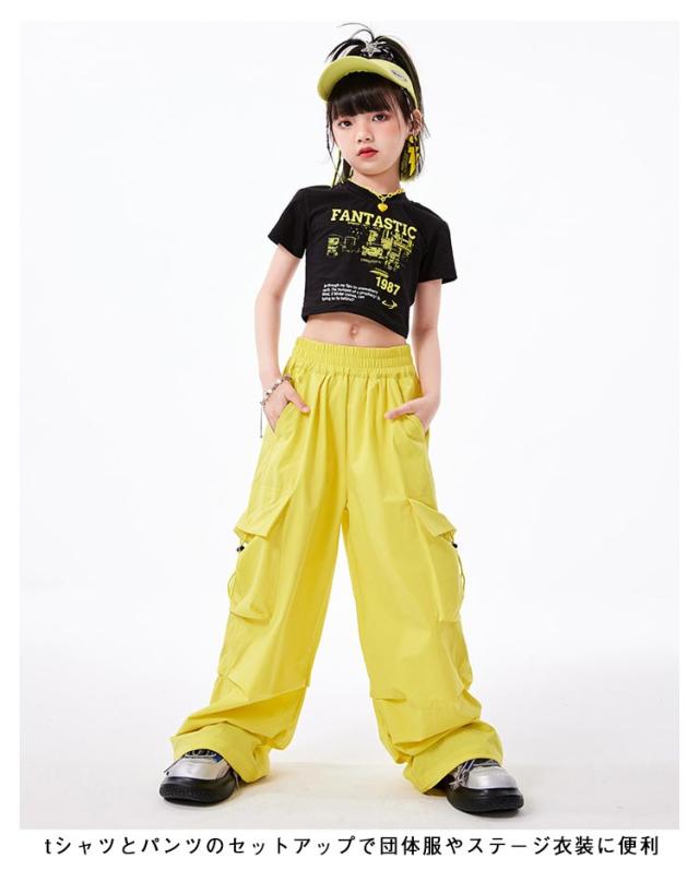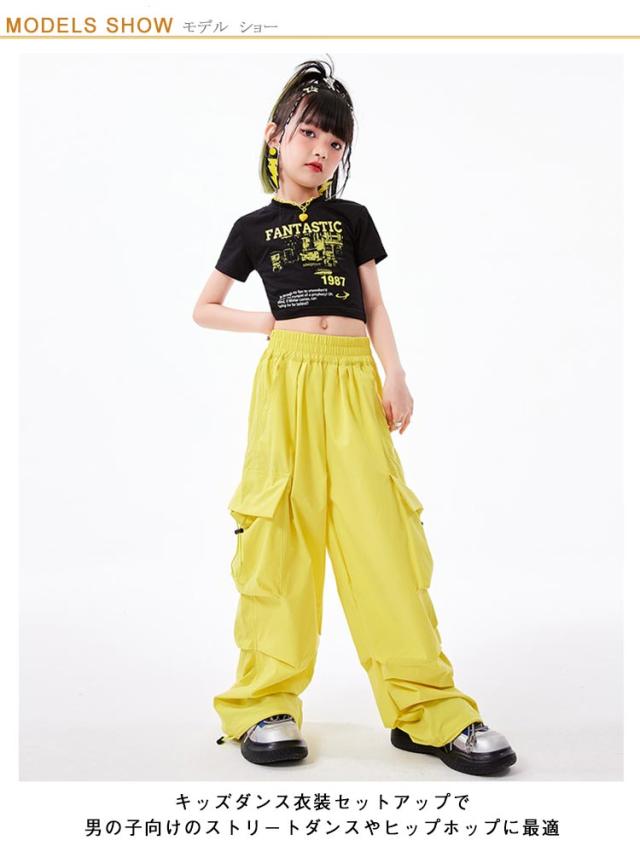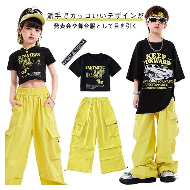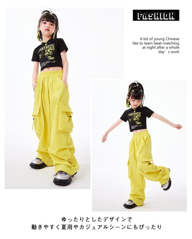 カーゴパンツ キッズ かっこいい ダンス衣装 黒 イエロー 黄色 半袖シャツ 黄色 へそ出し かわいい 韓国k-pop ダンスパンツ ジャズダンス ヒップホップ 原宿系 HIPHOP ステージ衣装 ブラック 演出服 団体服 応援団 運動会 男の子