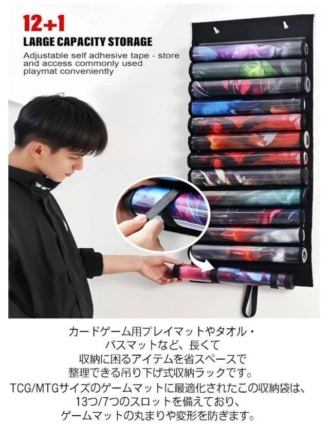 | プレイマットやカードゲームグッズをすっきり収納! カードゲーム用プレイマットやタオル・バスマットなど、長くて収納に困るアイテムを省スペースで整理できる吊り下げ式収納ラックです。 TCG/MTGサイズのゲームマットに最適化されたこの収納袋は、13つ/7つのスロットを備えており、ゲームマットの丸まりや変形を防ぎます。 透明PVC窓付きだから、収納したアイテムがひと目でわかり、探す手間を省いて迅速に取り出すことができます。 壁掛け・ドア掛けで設置できるので、スペースを無駄なく活用できます。 大切なプレイマットやコレクションを、見やすくキレイに整理! ホコリから守り、省スペースで大容量収納できる便利なウォールラックです。 底部にはナイロン製のストラップがあり、グルリと丸めて縛れるようにできるから、たくさんの巻物を綺麗にばらけず持ち運べる収納ケースです。 商品の特長 プレイマットやカードゲーム用品の収納に最適 巻物や細長いものもスッキリ整理 透明PVC窓で中身が一目で確認可能 吊り下げ式ウォールポケットでクロゼットやドアに簡単設置 ホコリ防止で大切なコレクションをしっかり守る 大容量収納でタオル・バスマット・ヨガマットにも対応 | |