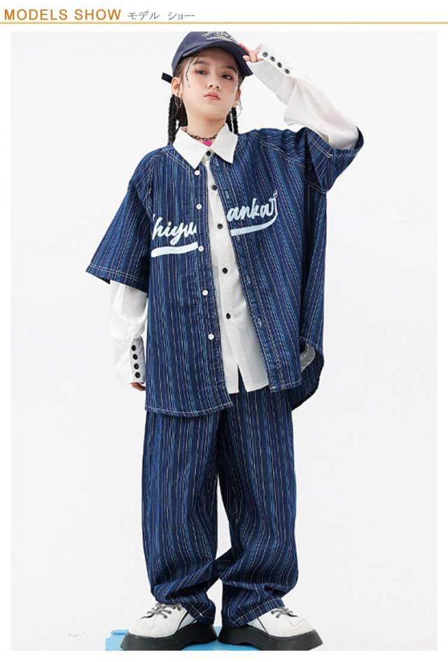 ワイドパンツ 半袖 ストライプ 服 デニム 目立つ デニム シャツ パンツ デニム キッズ 発表会 ヒップホップ ダンス衣装 ダボパン hiphop ハーフトップ 女の子 かっこいい 韓国 k-pop 練習着 演出服 目立つ 普段着 原宿系