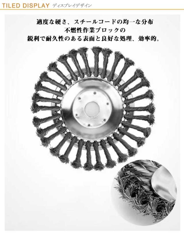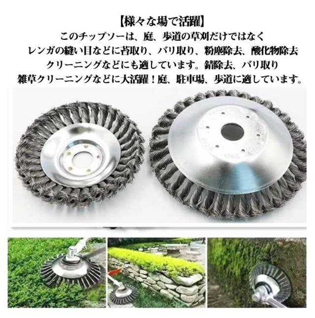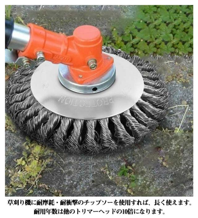 | 草刈り機 の替え刃先部に耐摩耗・耐衝撃用のタングステンカーバイトチップを使用、長く使えます。 スチールワイヤー材質を採用しており、頑丈で耐久性も優れています。雑草を効果的に除去します。 適度な硬さ、スチールコードの均一な分布、不燃性作業ブロックの鋭利で耐久性のある表面と良好な処理、効率的。 ほとんどのエンジン式と充電式草刈機に取り付けられます。 草刈り機に耐摩耗・耐衝撃のチップソーを使用すれば、長く使えます。耐用年数は他のトリマーヘッドの10倍になります。 【様々な場で活躍】このチップソーは、庭、歩道の草刈だけではなく、レンガの縫い目などに苔取り、バリ取り、粉塵除去、酸化物除去、クリーニングなどにも適しています。錆除去、バリ取り、雑草クリーニングなどに大活躍!庭、駐車場、歩道に適しています。 | |