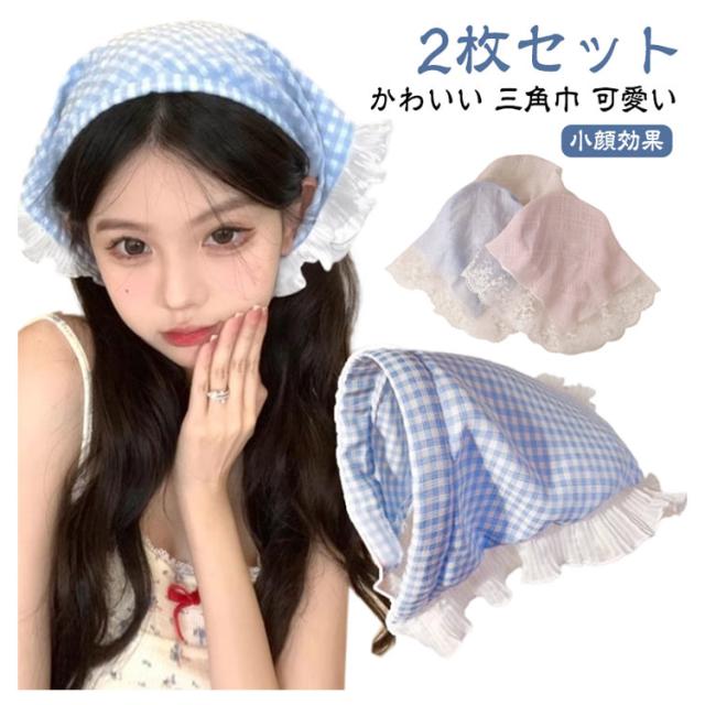三角巾 バンダナ シアー チェック柄 レース バブーシュカ 春 夏 カチューシャ かわいい 可愛い 2枚セット ヘアアレンジ ヘアバンド 小顔効果 帽子 透け感 2枚セット チェック ヘアターバンヘアアクセサリー おしゃれ 無地