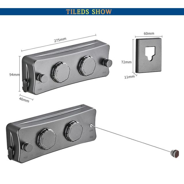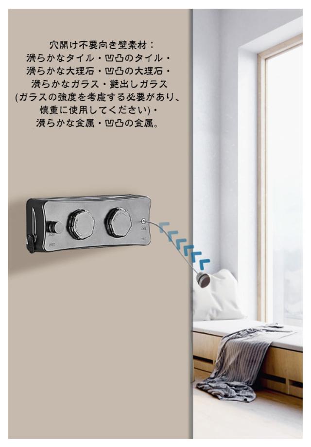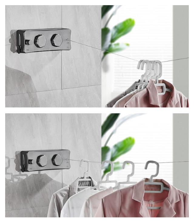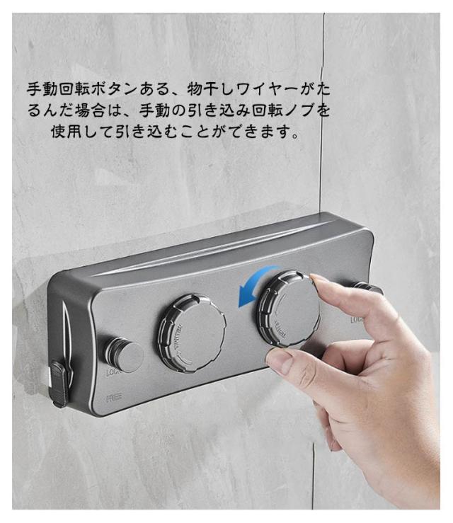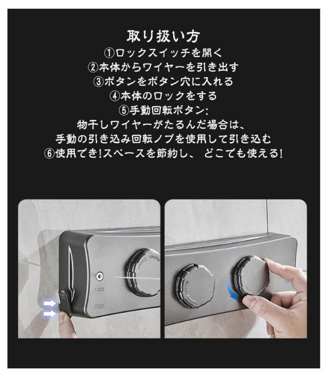 | 室内物干しワイヤー 耐荷重20kg 全長5.1M 調整可能 ダブルワイヤーのデザイン:シングルワイヤーと比べて、このダブルワイヤー室内物干しは乾燥スペースが2倍になります。2本のワイヤーで同時に衣類を乾燥できるため、乾燥の効率と速度が効果的に向上します。 強度耐久性向上:他製品より高い耐重力設計、洗濯物の重さ20kgまで余裕で耐えられるので、より多くの服・キルト・布団などあらゆる洗濯物を安心して掛けることができます。ワイヤーは最長5.1m、部屋の大きさに応じて必要な長さを調整することができます。手動回転ボタンある、物干しワイヤーがたるんだ場合は、手動の引き込み回転ノブを使用して引き込むことができます。 室内・室外両用が可能:伸縮可能な室内せんたくものほしワイヤーはを使う時だけ引っ張り出せて普段はすっきり収納。洗濯物干しワイヤーのシンプルな外観はあなたのホームデザインに溶け込むことができます。防水・防錆なので、室内だけでなく屋外でも使えます。雨・雪・花粉・スモッグなどの憂鬱な天候や梅雨季節と台風の日でも楽に洗濯を干すことができます。 2種類の設置方式:壁に穴を開けても、開けなくても取り付けることができます。穴を開けずに接着剤での取り付けができ、壁を傷付けずお引越しも楽々です。穴を開け必要がある時、専用のネジを付属し、簡単に取り付けることができます。 穴開け不要向き壁素材:滑らかなタイル・凹凸のタイル・滑らかな大理石・凹凸の大理石・滑らかなガラス・艶出しガラス(ガラスの強度を考慮する必要があり、慎重に使用してください)・滑らかな金属・凹凸の金属。 取り扱い方 1.ロックスイッチを開く 2.本体からワイヤーを引き出す 3.ボタンをボタン穴に入れる 4.本体のロックをする 5.手動回転ボタン: 物干しワイヤーがたるんだ場合は、手動の引き込み回転ノブを使用して引き込む 6.使用でき!スペースを節約し、 どこでも使える! | |