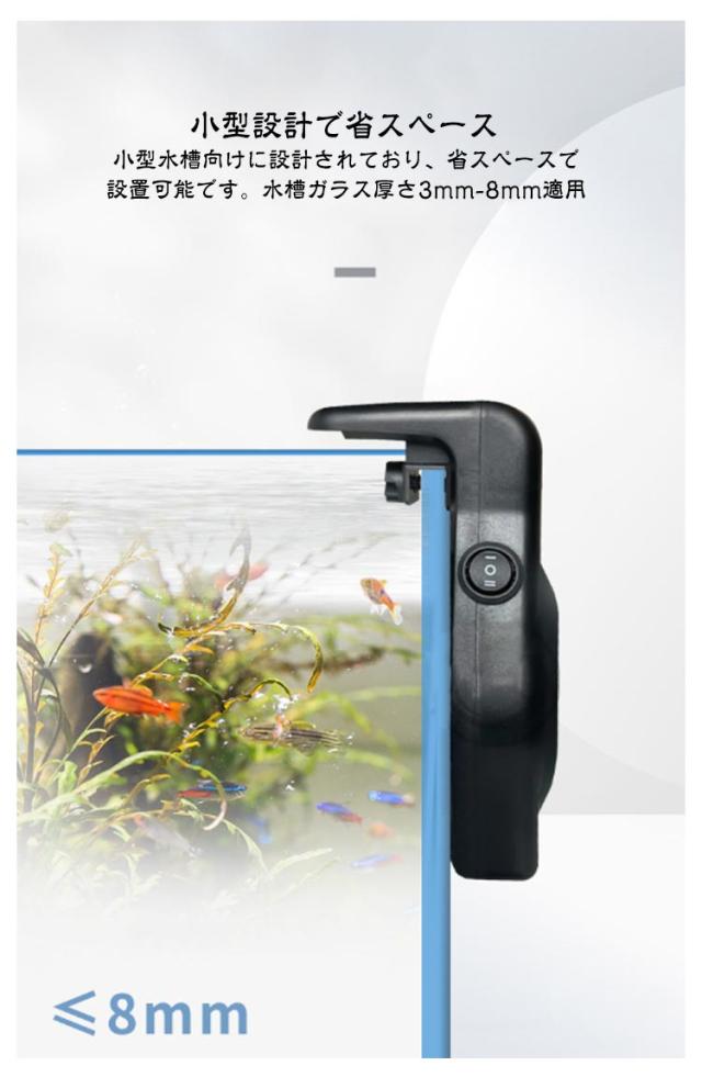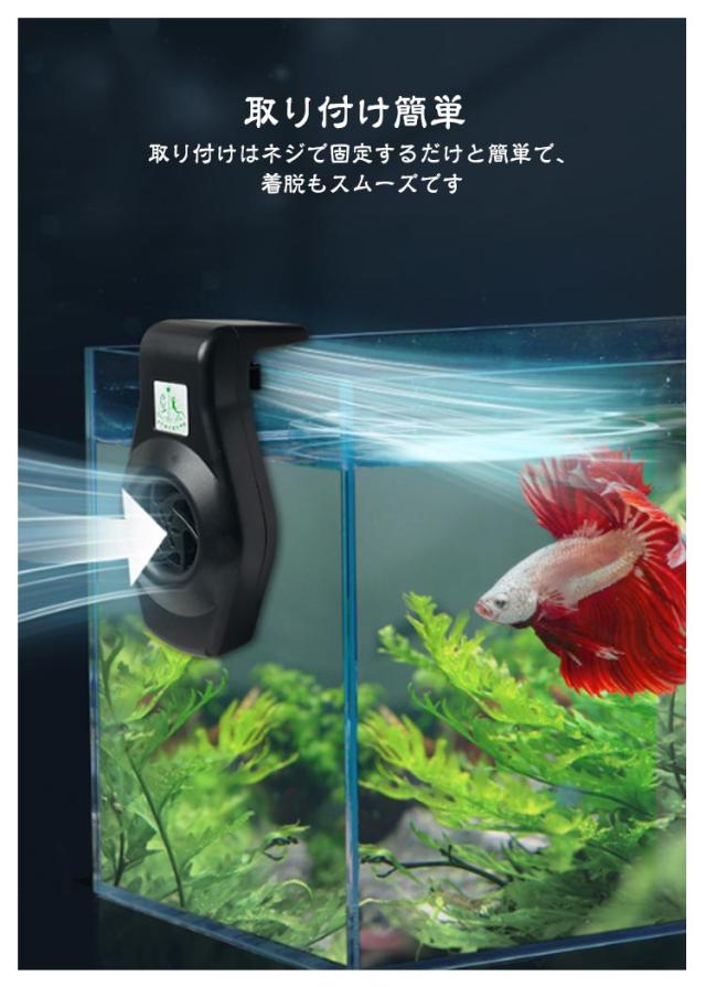 | 水槽冷却ファン【2個セット】 風量調整可能 取り付け簡単 水槽用クーラー コンパクトな設計で省スペースに設置できるUSB式クーラー 商品特徴: 小型デザイン 静音設計 水温昇進防止 掛け可能 2段階調節 USB給電タイプ <お勧めポイント> ●ポイント01 小型設計で省スペース 小型水槽向けに設計されており、省スペースで設置可能です。水槽ガラス厚さ3mm-8mm適用 ●ポイント02 2段階風量調整 風量は2段階で調整可能。強風モードでは水温を約2~4℃効果的に下げ、過熱を防止します ●ポイント03 取り付け簡単 取り付けはネジで固定するだけと簡単で、着脱もスムーズです ●ポイント04 魚夏対策 必要に応じて風力を調整でき、魚や水生生物にとって快適な水温環境を維持します ●ポイント05 温度管理に最適 夏場の高温時に魚のストレスや健康リスクを軽減し、安定した水温環境を提供します。 ●ポイント06 低騒音 長時間稼働しても騒音が少なく、家族や水槽内の生き物を邪魔しません。 ●ポイント07 USB給電タイプ 高品質ABS素材を採用し、耐摩耗性・耐腐食性に優れ、色あせやひび割れもしにくい仕様です | |