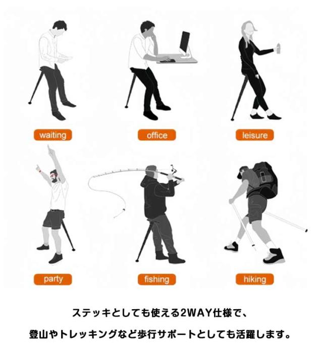 | サッと組み立てて使える1本脚折り畳みチェア。 チェア脚を少し斜めにして、後ろに寄りかかるイメージで座るのがおすすめです。 ステッキとしても使える2WAY仕様で、登山やトレッキングなど歩行サポートとしても活躍します。 テーマパークやイベントでの待ち時間や屋外イベントやアウトドアなどさまざまな場面でお使いになれます。 ちょっと腰を下ろしたい時にこれがあるととても役立ちます。 | |