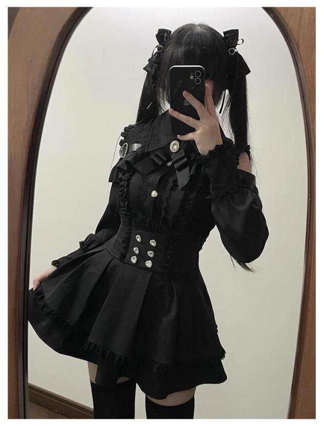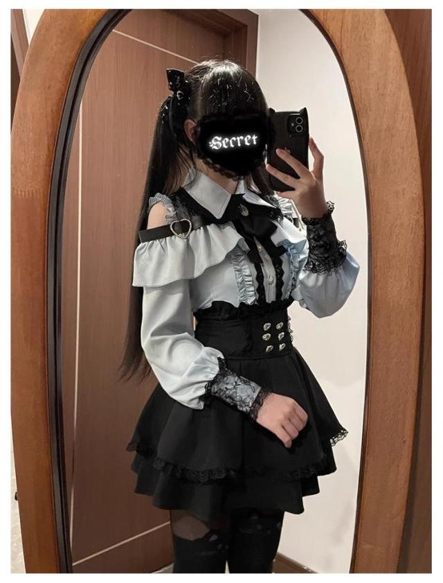 ワンピース レース オープンショルダー 地雷系 ハートバックル セットアップ フレンチ リボン 病みかわいい 量産型 長袖 服 フリル オープンショルダー スカート 肩出しブラウス Aライン 立ち襟 ガーリー系 お姫様 可愛い ロリータ ギャル おしゃれ 春 夏 秋
