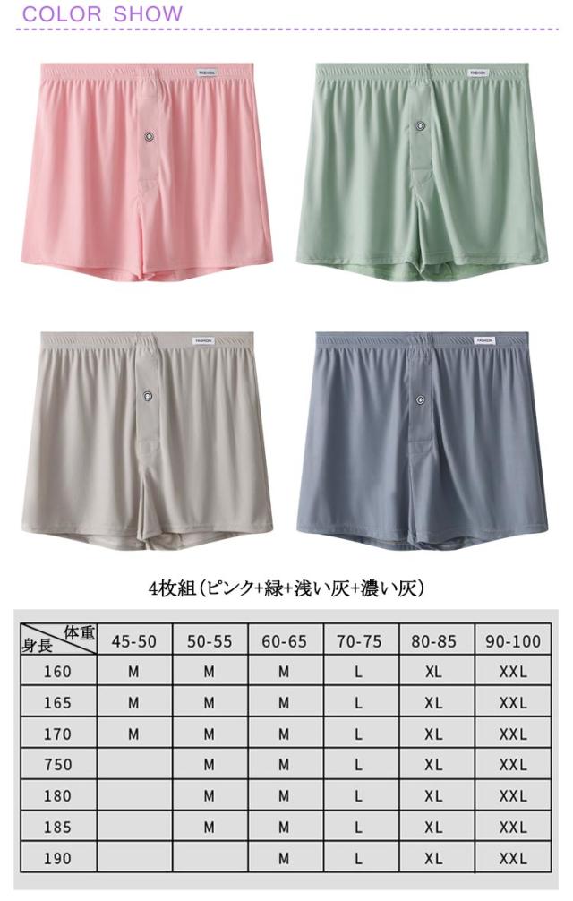 | 4枚セット!通気性抜群の素材で快適な履き心地のメンズトランクス! 柔らかく、ゆったりとした履き心地と、なめらかな肌触りで快適な着心地です 少し薄めの生地で抜群の通気性があり、暑い夏場に快適です。 アイスシルク素材で、吸汗速乾性に優れドライタッチ、清涼感のある肌触り。 トランクス派の方はもちろん、ボクサーパンツのしめつけが苦手の方に是非おすすめ。 | |