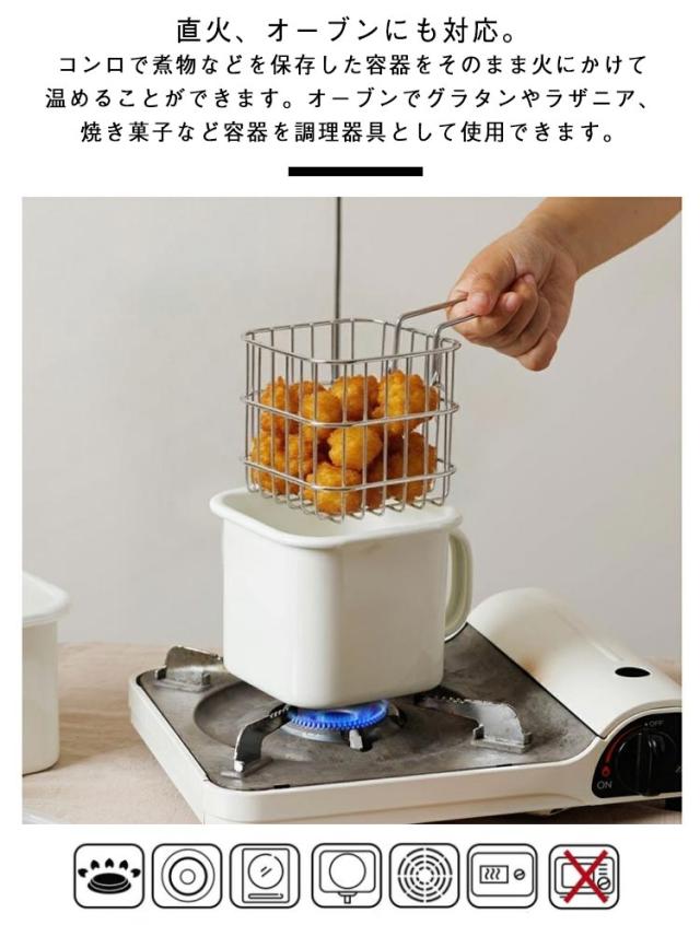 | 持ち手付きホーロー容器/味噌ポット 直火、オーブン対応 味噌の乾燥を防ぎ、おいしさ長持ち! 密閉できるフタ付なので、乾燥・酸化を防ぎ、食物が長持ちします。 直火、オーブンにも対応。コンロで煮物などを保存した容器をそのまま火にかけて温めることができます。オーブンでグラタンやラザニア、焼き菓子など容器を調理器具として使用できます。 大きな取っ手で持ちやすく、キッチンでの取り回しがとっても楽ちん! 表面がガラス質でできているホーローは、ニオイがつきにくく、汚れを落としやすいので、食材の保存にも最適です。 保存容器としてだけではなく幅広い使い方ができます。 ※加熱調理時は必ずフタを外してください。 | |