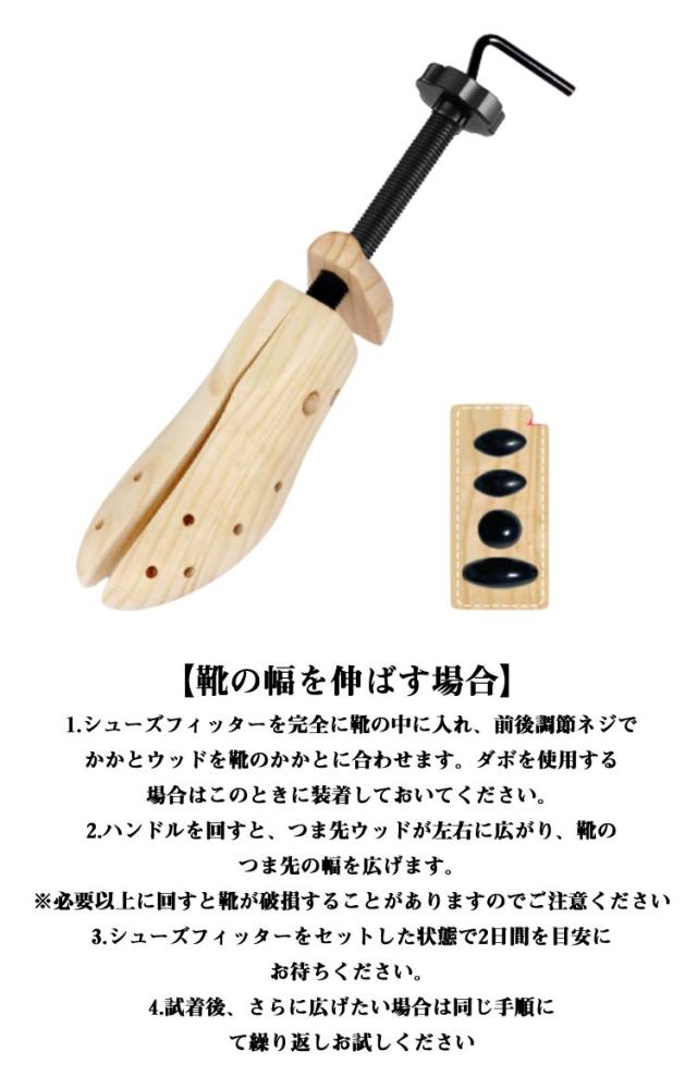 | 木製シューズストレッチャー。 革靴もパンプスもスニーカーも左右同時に簡単調節可能! 痛い部分を縦横に伸ばして、自分の足に合ったサイズに! 使い方は簡単!靴にセットしてハンドルを回して広げる。あとは数日待つだけ! 痛い親指辺りをもう少し!そんな時にはこれを穴に差すだけ、ダボで痛い付近をさらに拡張! 耐久度が大幅アップで気兼ねなく何回も使えます ぴったりフィットする靴に調整できる! 靴の型崩れ防止にも調整できる! 色々な靴に対応します 本体を靴に差し込み、かかとに合わせて調整するだけなので簡単です。 【ご使用方法】 1.シューズフィッターを完全に靴の中に入れます。かかとウッドが入らない場合は前後調節ネジを右回りに回して調節してください。ダボを使用する場合はこのときに装着しておいてください。 2.前後調節ネジをゆっくり回し、靴を伸ばしていきます。 ※必要以上に回すと靴が破損することがありますのでご注意ください 3.シューズフィッターをセットした状態で2日間を目安にお待ちください。 4.試着後、さらに広げたい場合は同じ手順にて繰り返しお試しください。 【靴の幅を伸ばす場合】 1.シューズフィッターを完全に靴の中に入れ、前後調節ネジでかかとウッドを靴のかかとに合わせます。ダボを使用する場合はこのときに装着しておいてください。 2.ハンドルを回すと、つま先ウッドが左右に広がり、靴のつま先の幅を広げます。 ※必要以上に回すと靴が破損することがありますのでご注意ください 3.シューズフィッターをセットした状態で2日間を目安にお待ちください。 4.試着後、さらに広げたい場合は同じ手順にて繰り返しお試しください | |