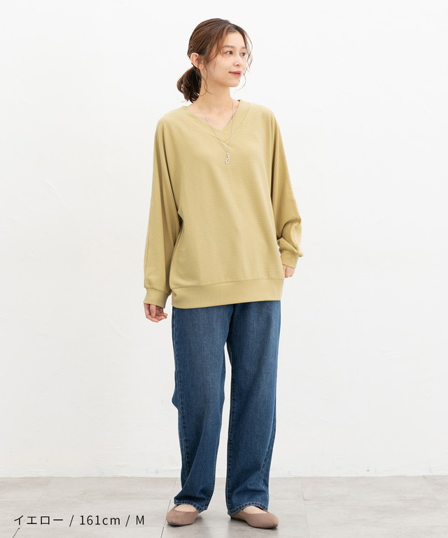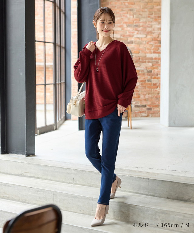 トップス カットソー 長袖 ドルマン袖 アクセサリー付き 再生ポリエステル Vネック 無地 ストレッチ レディース Honeys ハニーズ アクセ付ドルマントップス